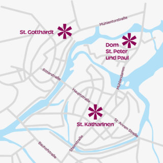 Nahe der drei Kirchen stehen kostenpflichtige Parkplätze zur Verfügung. Bitte informieren Sie sich vorab. Besucher:innen, die mit der Bahn anreisen, nutzen den Regionalexpress der Linie 1. Vom Brandenburger Hauptbahnhof gelangen Sie mit dem ÖPNV zu den drei Kirchen. Bei schönem Wetter empfiehlt sich der Fußweg vom Brandenburger Hauptbahnhof aus.